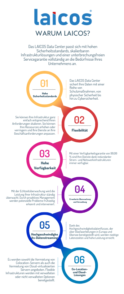 Das LAICOS-Datenzentrum bietet sowohl Co-Location-Serververmietung als auch Cloud-Virtualisierte-Serververmietung an. Diese Dienste sind sowohl in Managed- als auch in Unmanaged-Optionen verfügbar, abgestimmt auf Ihre Bedürfnisse.